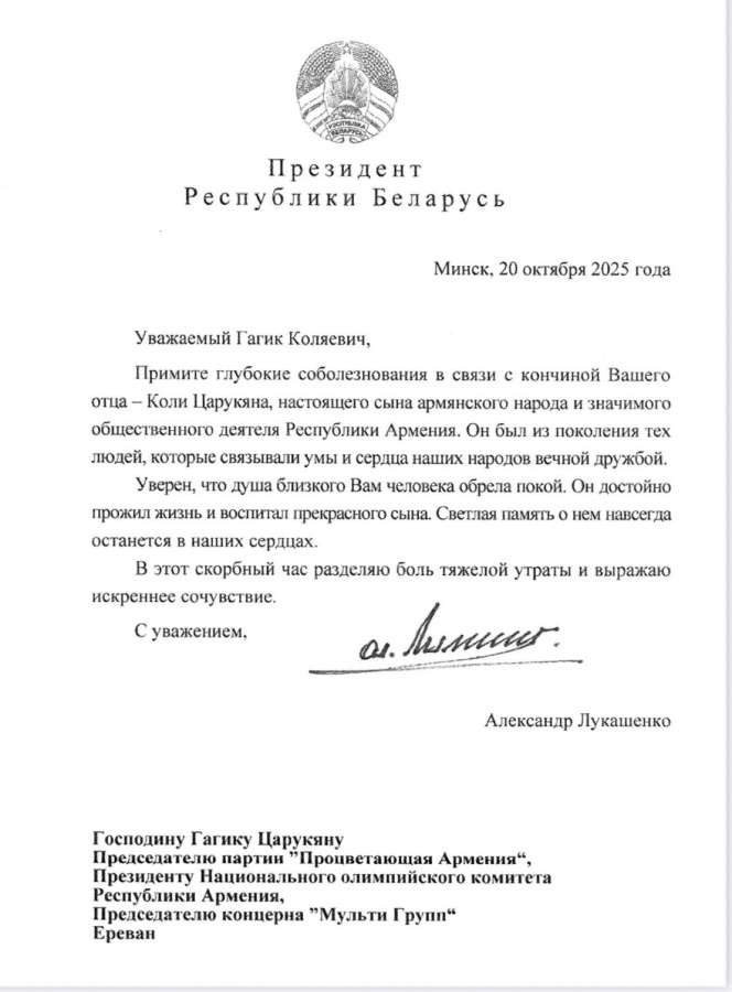 Հարգանքով՝ Ալեքսանդր Լուկաշենկո»:
