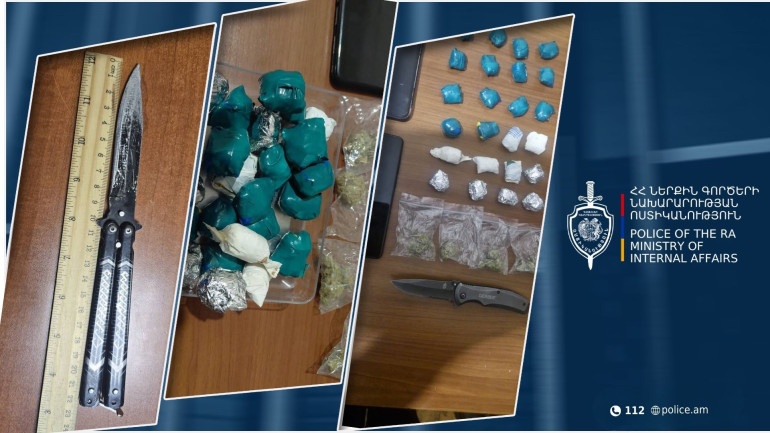Նրա անձնական խուզարկությամբ հայտնաբերվել են մարիխուանա տեսակի թմրամիջոցի նմանվող զանգվածով 28 փաթեթ՝ ընդհանուր 74,69 գրամ քաշով, և ծալովի դանակ: