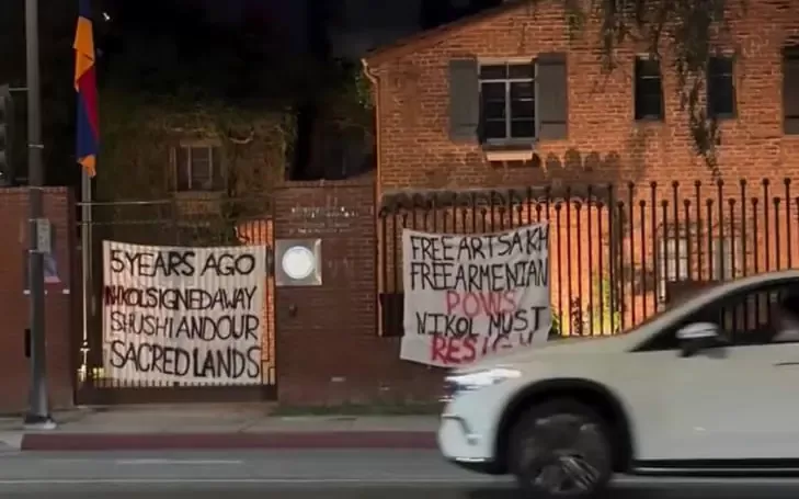 Նրանք Հյուպատոսության դարպասներին փակցրել են «5 տարի առաջ Նիկոլը հանձնեց Շուշին և մեր սուրբ հողերը» և «Ազատ Արցախ, ազատություն հայ ռազմագերիներին, Նիկոլը պետք է հեռանա» գրությամբ պաստառներ։