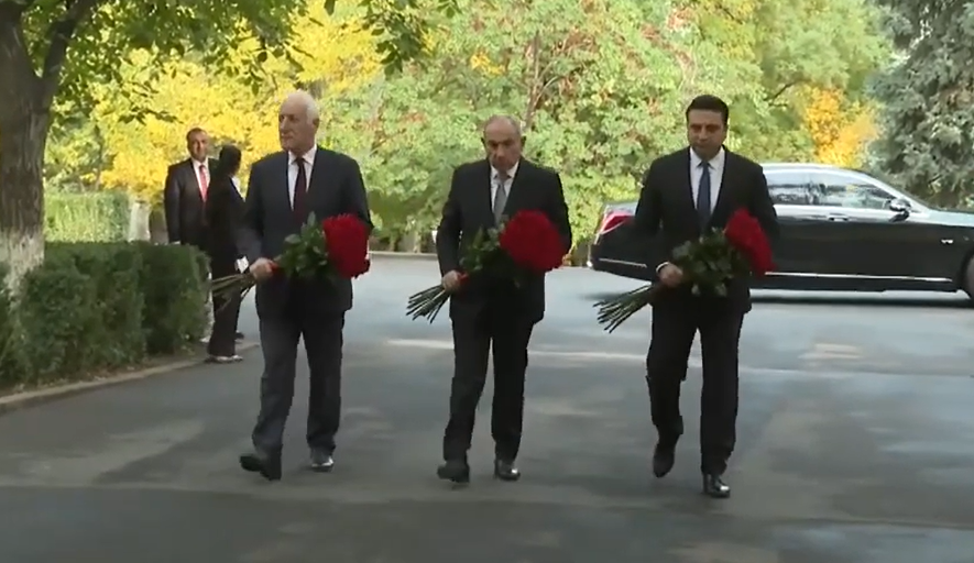 Նիկոլ Փաշինյանը, ՀՀ նախագահ Վահագն Խաչատուրյանը, օրենսդիր և գործադիր մարմինների ներկայացուցիչները ծաղիկներ են խոնարհել ԱԺ բակում գտնվող Հոկտեմբերի 27-ի զոհերի հուշակոթողի մոտ: