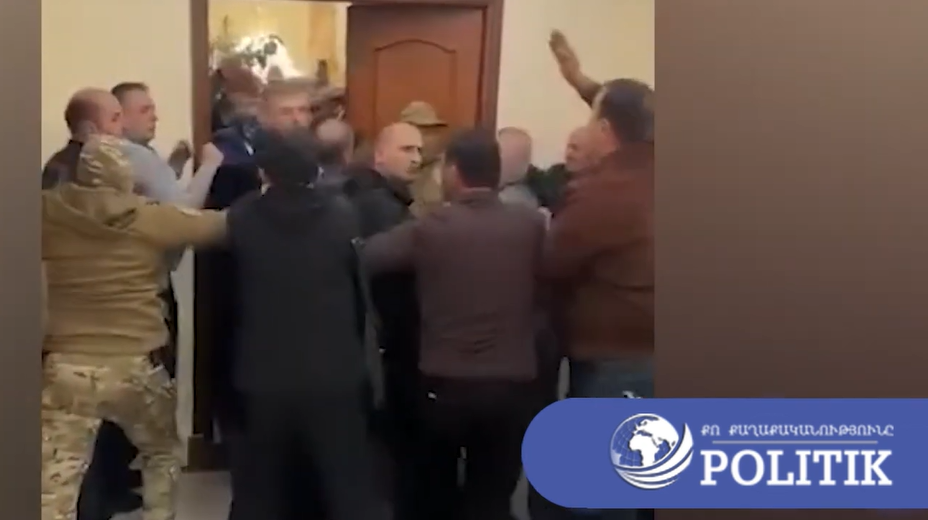 Քաղաքապետարանի մուտքի մոտ ինչ–որ պահի իրավիճակը լարվեց. քաշքշոց սկսվեց հավաքվածների և ոստիկանների միջեւ։