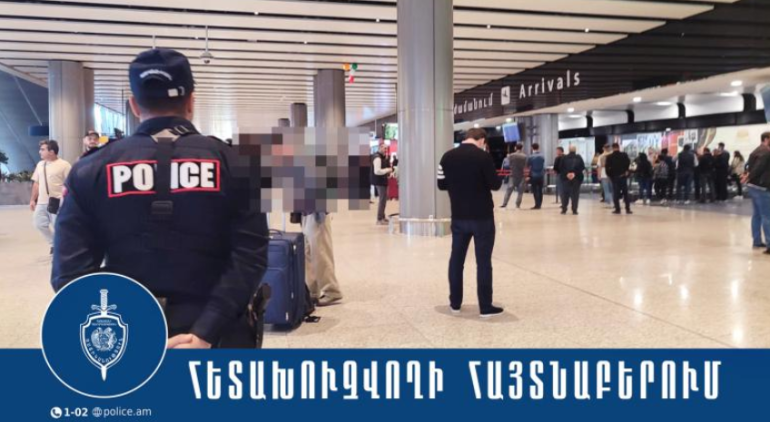 Նոյեմբերի 9-ին` ժամը 15.15-ին, Համայնքային ոստիկանության «Զվարթնոց» օդանավակայանի բաժնի ծառայողների ձեռնարկած օպերատիվ-հետախուզական միջոցառումների շնորհիվ Երևան-Սոչի չվերթի հաշվառումից հետո բաժին է բերվել 44-ամյա օտարերկրյա քաղաքացի, որը 2024 թվականի մայիսից հետախուզվում էր Վրաստանի Ինտերպոլի կողմից՝ խարդախության և փողերի լվացման մեղադրանքով, խափանման միջոցը՝ կալանք։ Այս մասին հայտնում են ՆԳՆ-ից: